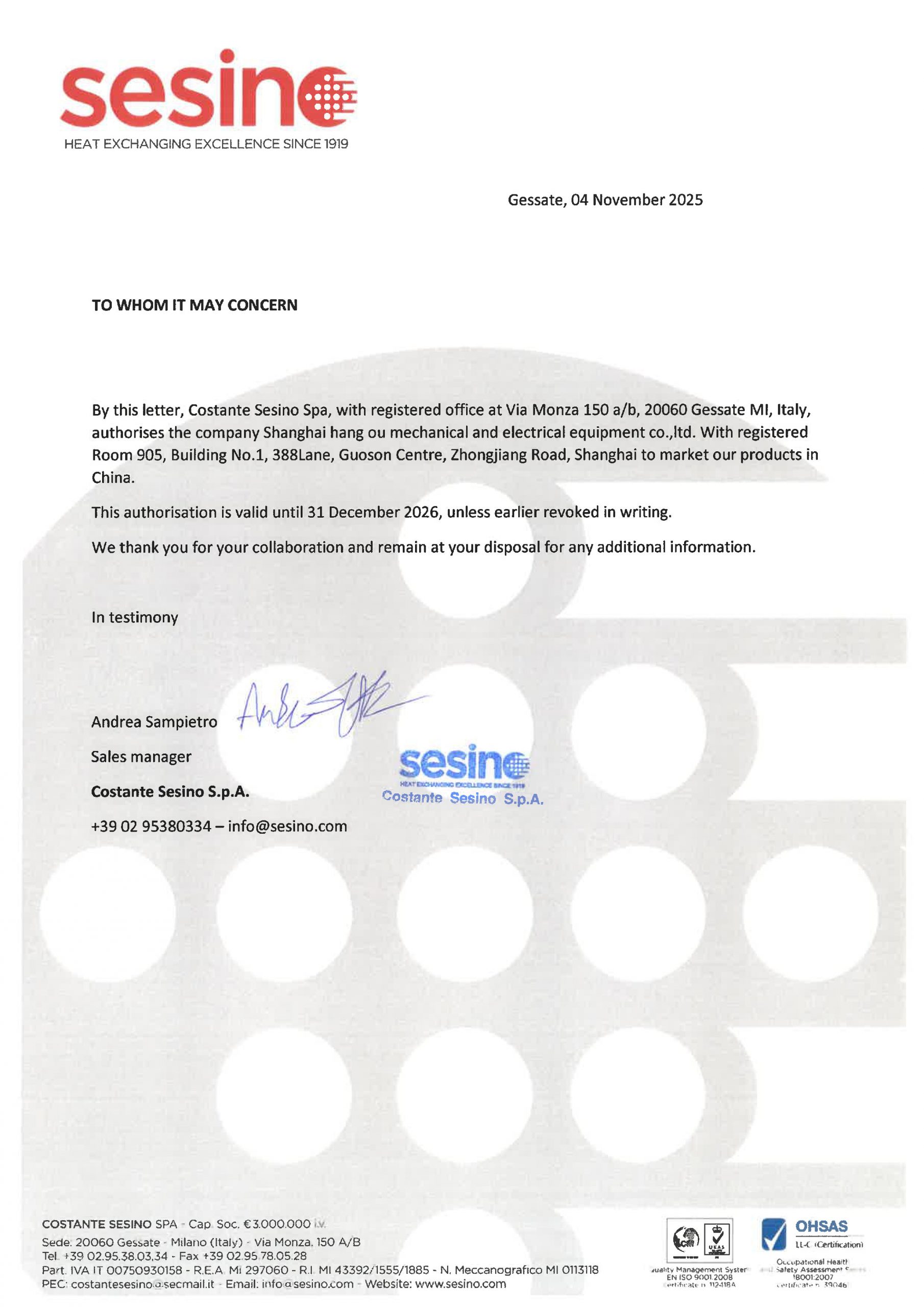 2025年意大利SESINO工廠授權(quán)上海航歐代理商